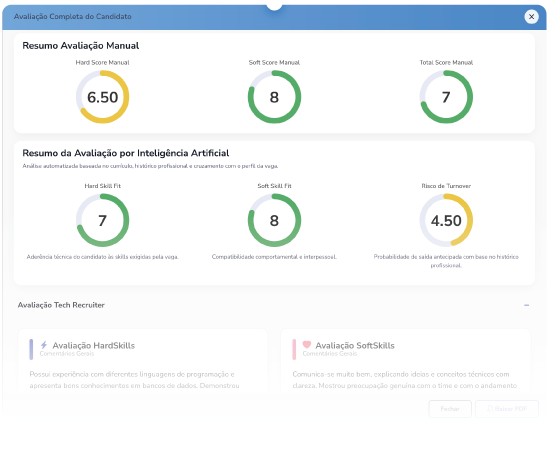 A Vylex está inovando na forma de apresentar talentos ao cliente. Nossa nova plataforma gera um relatório com resumo executivo do candidato, unindo análise de IA e avaliação manual do Tech Recruiter.Isso permite uma leitura mais estratégica do perfil, com mais clareza sobre competências, aderência à oportunidade e percepção consultiva do processo. O resultado é uma experiência mais moderna, mais objetiva e mais confiável para quem contrata.
